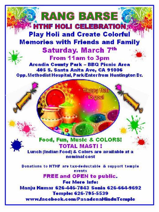 The Pasadena Hindu Temple would like to invite all it's devotees and their families and friends to the Annual HTHF Holi Celebration on Saturday, March 7 from 11:00 a.m. to 3:00 p.m. at the Arcadia County Park, Arcadia. Please check our flyer HERE for more details.
